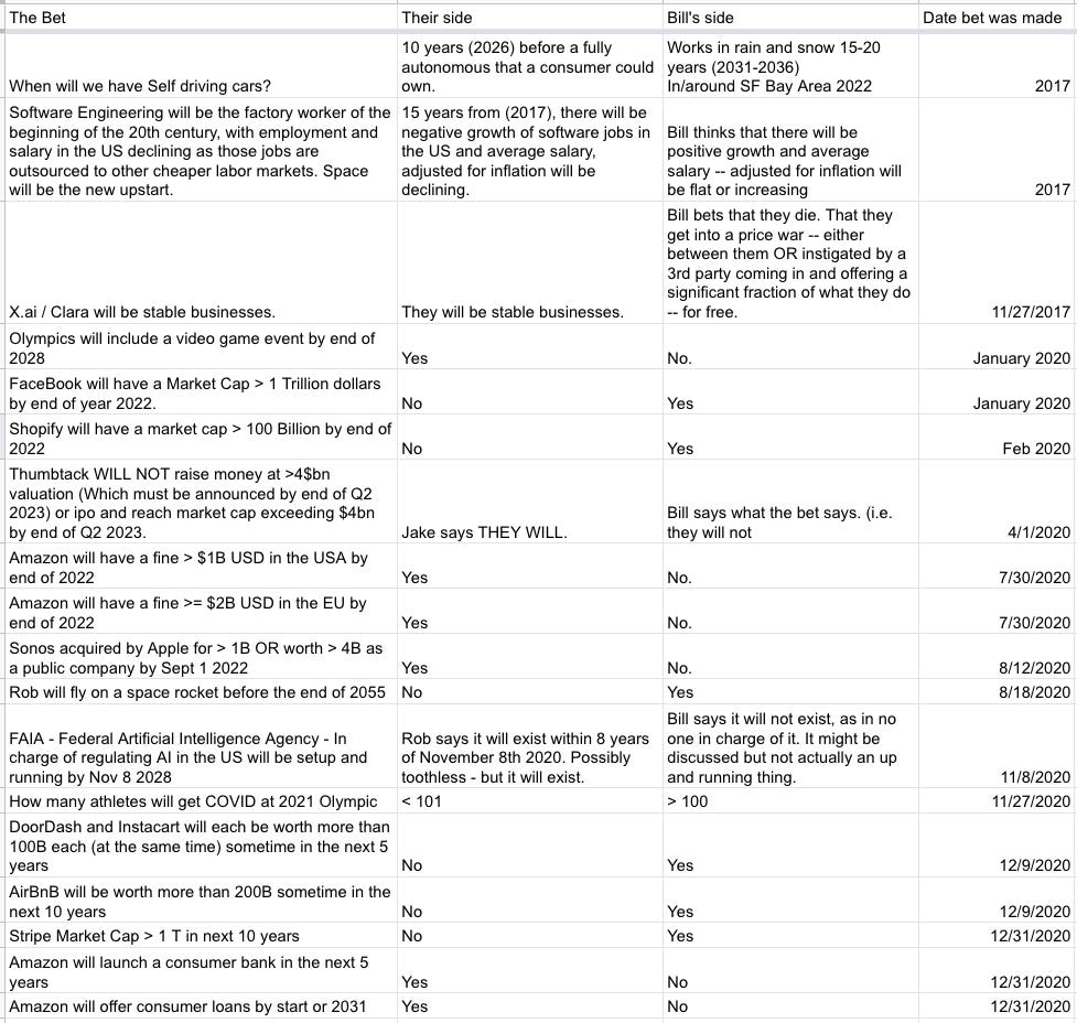 I like to bet with friends about when technology will arrive, and how companies will preform. Here is a snapshot of my active bets: