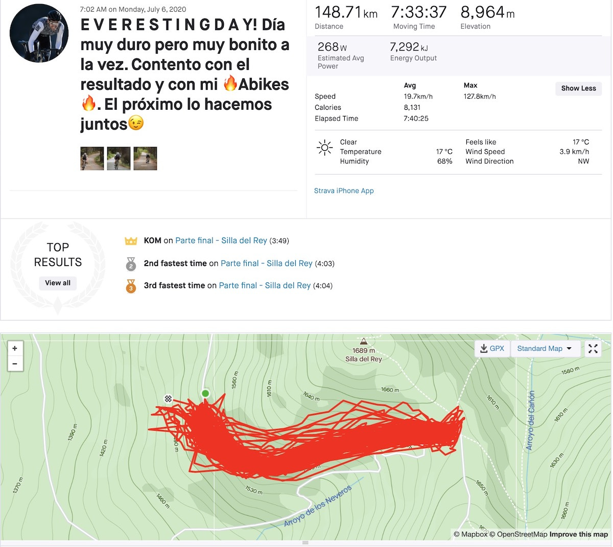 Everesting - Pick any hill, anywhere in the world and complete repeats of it in a single activity until you climb 8,848m – the equivalent height of Mt Everest. Alberto Contador set a new Everesting record in a time of 7 hours, 27 minutes and 20 seconds.